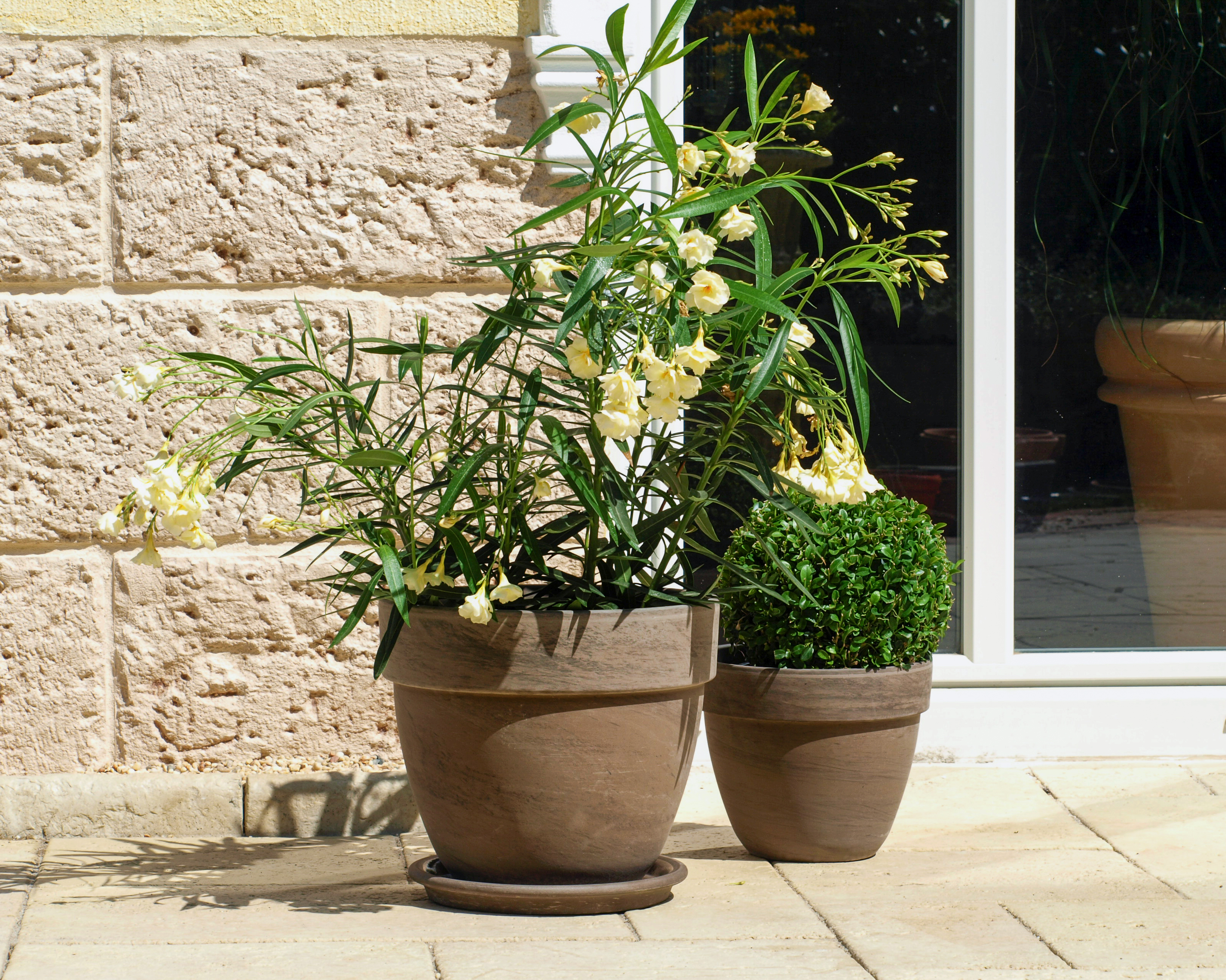 Der Pflanztopf Levante besticht durch seine bauchiges Pflanzvolumen. Der gedrungene Pflanztopf ist in marmor und basalt Ton erhältlich.